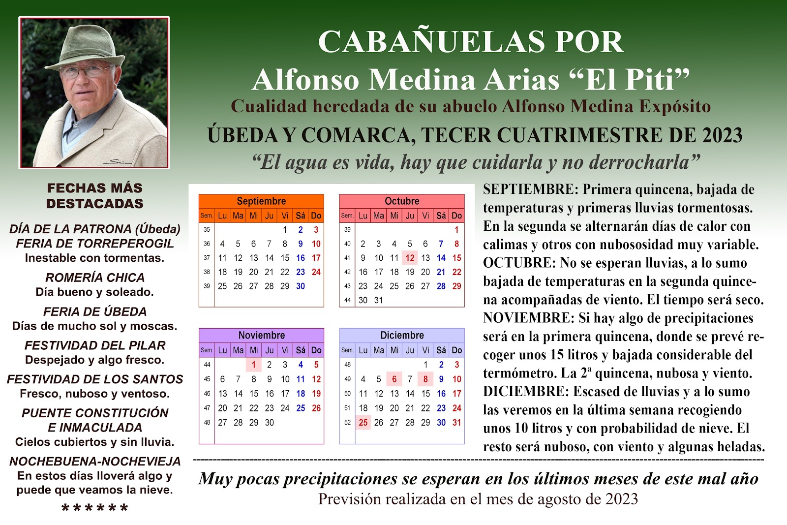 Nos ha hecho llegar, una vez más, nuestro a migo El Piti las cabañuelas para los próximos cuatro meses. Vamos a ver si no se cumplen al pie de la letra sus predicciones, porque lleva mucho tiempo anunciando poca lluvia y se está cumpliendo. En el próximo cuatrimestre nos avanzará el pronóstico del tiempo para las fechas de Carnaval, que es lo que a nosotros nos interesa.
